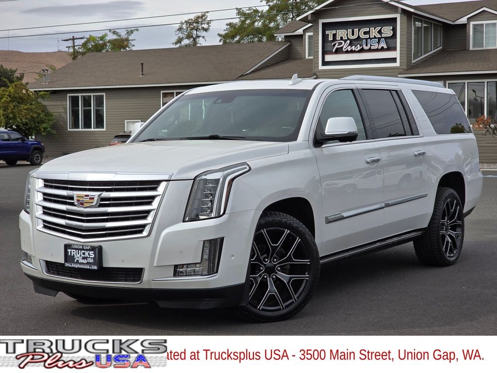 Clean CARFAX. Crystal White Tricoat 2017 Cadillac Escalade ESV Platinum Edition Vortec 6.2L V8 SIDI 8-Speed Automatic 4WD 4D Sport Utility 4WD, 16 Speakers, 3.23 Axle Ratio, 3rd Row DVD Screen, 3rd row seats: split-bench, 4-Wheel Disc Brakes, A/V remote, ABS brakes, Adaptive Full-Speed Range Cruise Control, Adaptive suspension, Adjustable pedals, Air Conditioning, All-Weather 1st, 2nd & 3rd Row Floor Mats (LPO), All-Weather Cargo Mat (LPO), Alloy wheels, AM/FM radio: SiriusXM, Apple CarPlay, Auto High-beam Headlights, Auto tilt-away steering wheel, Auto-dimming door mirrors, Auto-leveling suspension, Automatic Safety Belt Tightening, Automatic temperature control, Bodyside moldings, Bose Centerpoint Surround Sound System, Brake assist, Bumpers: body-color, CD player, Compass, Cooled Console w/Covered Storage, Delay-off headlights, Driver Assist Package, Driver door bin, Driver vanity mirror, Dual DVD Screens, Dual front impact airbags, Dual front side impact airbags, DVD-Audio, Electronic Powered Parking Brake, Electronic Stability Control, Emergency communication system: OnStar Protection, Exterior Parking Camera Rear, Front & Rear Automatic Braking, Front anti-roll bar, Front Bucket Seats, Front Center Armrest w/Storage, Front Cornering Lamps, Front dual zone A/C, Front reading lights, Front wheel independent suspension, Fully automatic headlights, Garage door transmitter, Genuine wood dashboard insert, HD Radio, Headphones, Heads-Up Display, Heated & Cooled Front Bucket Seats, Heated door mirrors, Heated front seats, Heated rear seats, Heated steering wheel, Illuminated Door Handles, Illuminated entry, Inclination Sensor, Interior Protection Package (LPO), Lane Change Alert, Leather Shift Knob, Leather steering wheel, Leather Wrapped IP/Console/Door, Low tire pressure warning, Magnetic Ride Control Suspension, Memory seat, Microfiber Sueded Headliner, Navigation System, NavTraffic, Occupant sensing airbag, Outside temperature display, Overhead airbag, Overhead console, Panic alarm, Passenger door bin, Passenger vanity mirror, Pedal memory, Platinum Package, Platinum Sill Plates, Power door mirrors, Power driver seat, Power Liftgate, Power moonroof, Power passenger seat, Power steering, Power Tilt-Sliding Sunroof w/Express-Open/Close, Power windows, Preferred Equipment Group 1SD, Premium Floor Mats, Radio data system, Radio: Cadillac CUE Info/Media Ctrl Sys w/Embd Nav, Rain sensing wipers, Rear air conditioning, Rear anti-roll bar, Rear audio controls, Rear Camera Mirror, Rear Camera Washer, Rear Cross-Traffic Alert, Rear reading lights, Rear Seat Entertainment System, Rear window defroster, Rear window wiper, Reconfigurable 4-Color Head-Up Display, Remote keyless entry, Roof rack: rails only, Second Row Bucket Seats, Security system, Semi-Aniline Full Leather Seating Surfaces, Side Blind Zone Alert, SiriusXM Satellite Radio, Speed control, Split folding rear seat, Spoiler, Steering wheel memory, Steering wheel mounted audio controls, Tachometer, Telescoping steering wheel, Theft-Deterrent Alarm System, Theft-Deterrent Package, Tilt steering wheel, Traction control, Trip computer, Turn signal indicator mirrors, Unique Exotic Wood, Unique Grille Design, VAC Power 17" Disc Brakes, Variably intermittent wipers, Vehicle Interior Movement Sensor, Ventilated front seats, Wheel Locks, Wheels: 22" x 9" Premium Painted w/Chrome Inserts, 4WD.