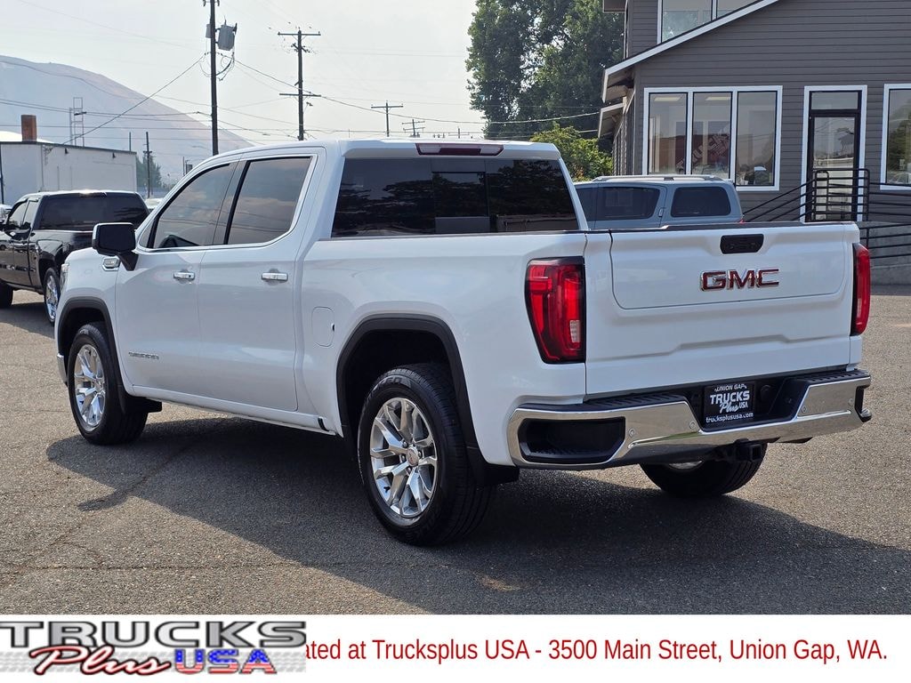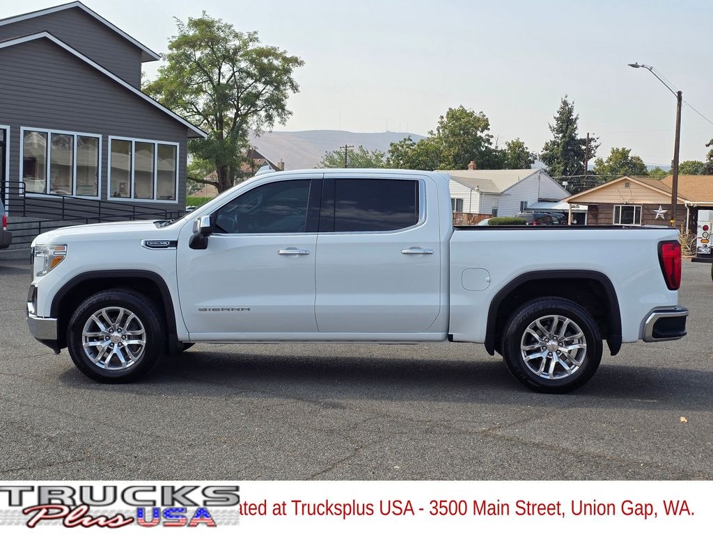 Clean CARFAX. White 2019 GMC Sierra 1500 SLT EcoTec3 5.3L V8 8-Speed Automatic 4WD 4D Crew Cab 8-Speed Automatic, 4WD, Leather, 10-Way Power Driver Seat Adjuster w/Lumbar, 10-Way Power Passenger Seat Adjuster w/Lumbar, 12-Volt Rear Auxiliary Power Outlet, 120-Volt Bed Mounted Power Outlet, 120-Volt Instrument Panel Power Outlet, 170 Amp Alternator, 3.23 Rear Axle Ratio, 4-Wheel Disc Brakes, 6 Speakers, 6-Speaker Audio System Feature, ABS brakes, Air Conditioning, Alloy wheels, AM/FM radio: SiriusXM, Apple CarPlay/Android Auto, Auto-dimming door mirrors, Auto-dimming Rear-View mirror, Automatic temperature control, Auxiliary External Transmission Oil Cooler, Brake assist, Bumpers: chrome, Chrome Grille, Color-Keyed Carpeting Floor Covering, Compass, Deep-Tinted Glass, Delay-off headlights, Driver door bin, Driver Memory, Driver vanity mirror, Dual front impact airbags, Dual front side impact airbags, Electric Rear-Window Defogger, Electrical Lock Control Steering Column, Electronic Stability Control, Front 40/20/40 Split-Bench Seat, Front anti-roll bar, Front Center Armrest w/Storage, Front dual zone A/C, Front fog lights, Front Frame-Mounted Black Recovery Hooks, Front reading lights, Front wheel independent suspension, Fully automatic headlights, GMC 4G LTE, GMC Connected Access, HD Radio, Heated door mirrors, Heated Driver & Front Passenger Seating, Heated front seats, Heated steering wheel, Heavy Duty Suspension, Heavy-Duty Rear Locking Differential, Hitch Guidance, Hitch Guidance w/Hitch View, Illuminated entry, In-Vehicle Trailering App, Integrated Trailer Brake Controller, Keyless Open & Start, LED Cargo Area Lighting, Low tire pressure warning, Manual Tilt-Wheel & Telescoping Steering Column, Memory seat, Occupant sensing airbag, OnStar & GMC Connected Services Capable, Outside temperature display, Overhead airbag, Overhead console, Panic alarm, Passenger door bin, Passenger vanity mirror, Perforated Leather-Appointed Seat Trim, Power Door Locks, Power door mirrors, Power driver seat, Power Front Passenger Windows w/Express Up/Down, Power Front Windows w/Driver Express Up/Down, Power passenger seat, Power Rear Windows w/Express Down, Power steering, Power windows, Premium audio system: GMC Infotainment System, Radio data system, Radio: Premium GMC Infotainment Sys w/Multi-Touch, Rear Dual USB Charging-Only Ports, Rear reading lights, Rear seat center armrest, Rear step bumper, Rear Wheelhouse Liners, Rear window defroster, Remote keyless entry, Remote Vehicle Starter System, Security system, SiriusXM Radio, Speed control, Speed-sensing steering, Split folding rear seat, Steering Wheel Audio Controls, Steering wheel mounted audio controls, Tachometer, Telescoping steering wheel, Theft Deterrent System (Unauthorized Entry), Tilt steering wheel, Traction control, Trailering Package, Trip computer, Variably intermittent wipers, Voltmeter, Wheels: 18" x 8.5" 6-Spoke Machined Aluminum, 8-Speed Automatic, 4WD, Leather.