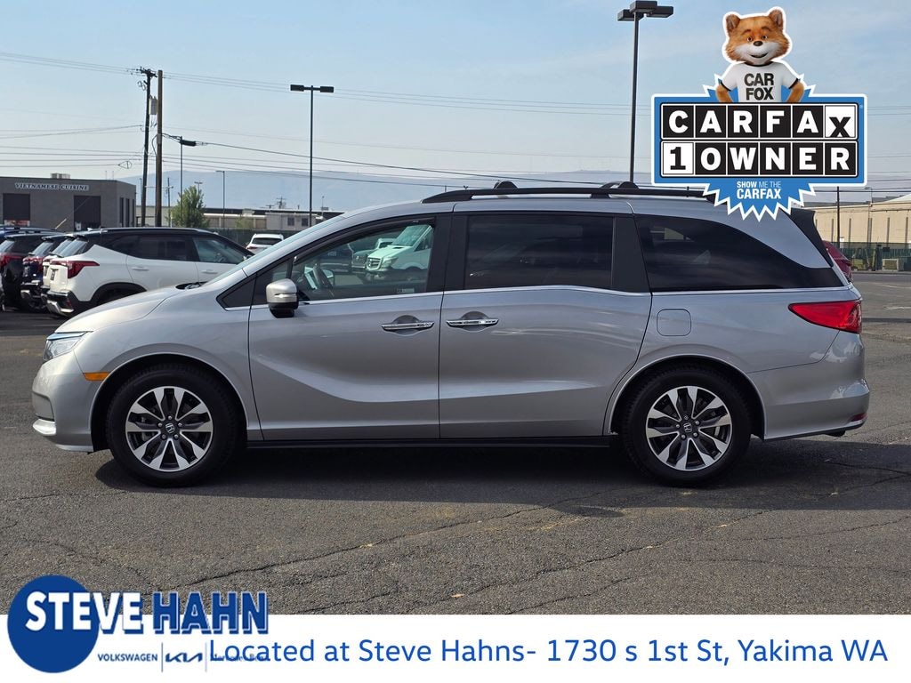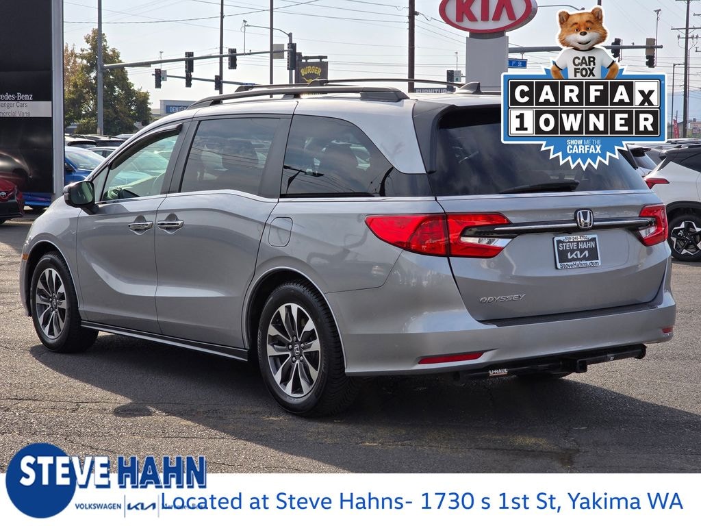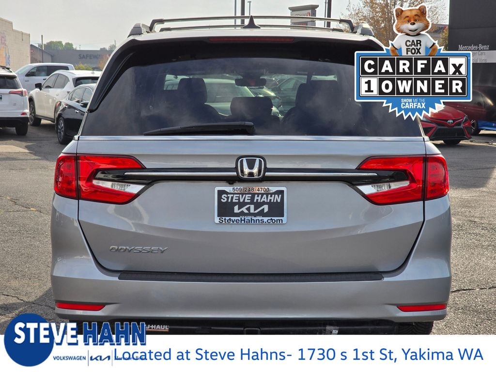 CARFAX One-Owner. Gray 2022 Honda Odyssey EX-L 3.5L V6 SOHC i-VTEC 24V 10-Speed Automatic FWD 4D Passenger Van 18" Machine-Finished Alloy Wheels, 3.61 Axle Ratio, 3rd row seats: split-bench, 4-Wheel Disc Brakes, 7 Speakers, A/V remote: CabinControl, ABS brakes, Adaptive Cruise Control: Adaptive Cruise Control (ACC) with Low-Speed Follow, Air Conditioning, Alloy wheels, AM/FM radio: SiriusXM, Anti-whiplash front head restraints, Apple CarPlay/Android Auto, Auto High-beam Headlights, Auto-dimming Rear-View mirror, Automatic temperature control, Blind Spot Information (BSI) System warning, Brake assist, Bumpers: body-color, Delay-off headlights, Driver door bin, Driver vanity mirror, Driver's Seat Mounted Armrest, Dual front impact airbags, Dual front side impact airbags, Electronic Stability Control, Exterior Parking Camera Rear, Forward collision: Collision Mitigation Braking System (CMBS) + FCW mitigation, Four wheel independent suspension, Front anti-roll bar, Front Bucket Seats, Front dual zone A/C, Front fog lights, Front reading lights, Fully automatic headlights, Garage door transmitter: HomeLink, Heated door mirrors, Heated Front Bucket Seats, Heated front seats, Illuminated entry, Knee airbag, Lane departure: Lane Keeping Assist System (LKAS) active, Leather Seat Trim, Leather steering wheel, Low tire pressure warning, Memory seat, Occupant sensing airbag, Outside temperature display, Overhead airbag, Overhead console, Panic alarm, Passenger door bin, Passenger seat mounted armrest, Passenger vanity mirror, Power door mirrors, Power driver seat, Power Liftgate, Power moonroof, Power passenger seat, Power steering, Power windows, Radio data system, Radio: 160-Watt AM/FM/HD/SiriusXM Audio System, Rear air conditioning, Rear anti-roll bar, Rear reading lights, Rear seat center armrest, Rear window defroster, Rear window wiper, Reclining 3rd row seat, Remote keyless entry, Security system, Speed control, Speed-sensing steering, Speed-Sensitive Wipers, Split folding rear seat, Spoiler, Steering wheel mounted audio controls, Tachometer, Telescoping steering wheel, Tilt steering wheel, Traction control, Trip computer, Turn signal indicator mirrors, Variably intermittent wipers.